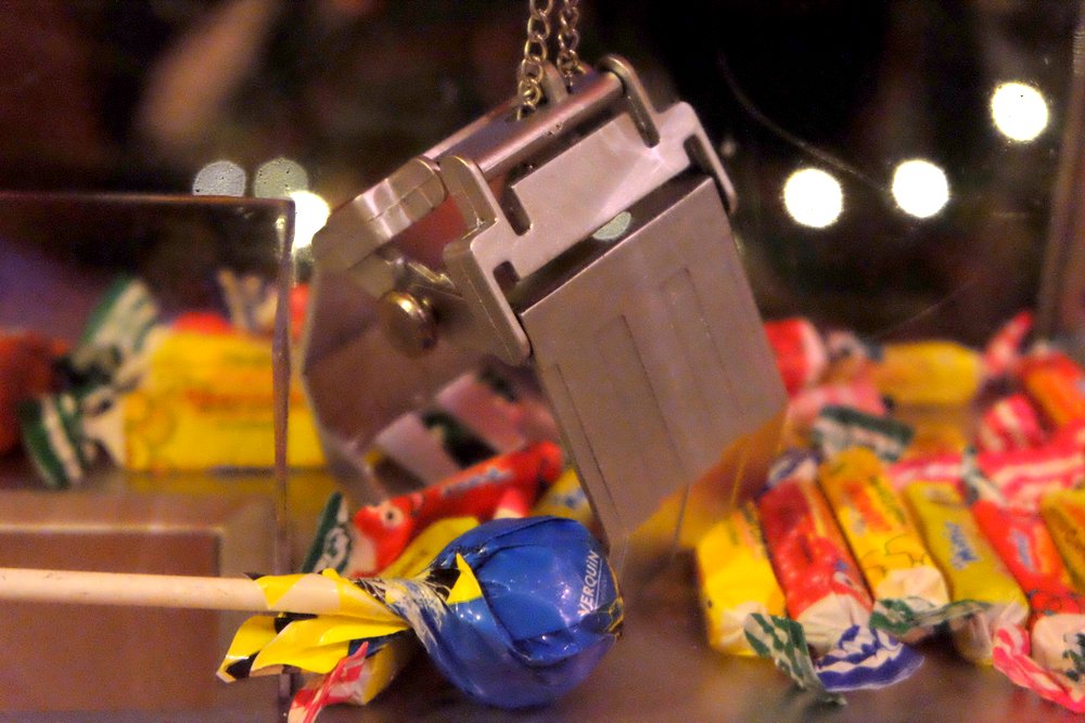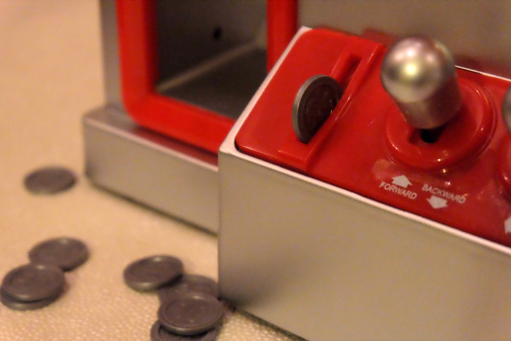Pour activer le bras mécanique, il suffit de glisser dans la fente les pièces factices livrées avec la machine. Sauf que ma 9 ans a décidé de les planquer et de faire payer en espèces sonnantes et trébuchantes quiconque voudra tenter sa chance.