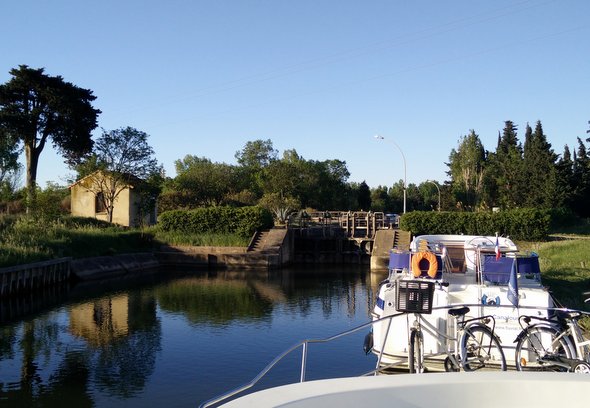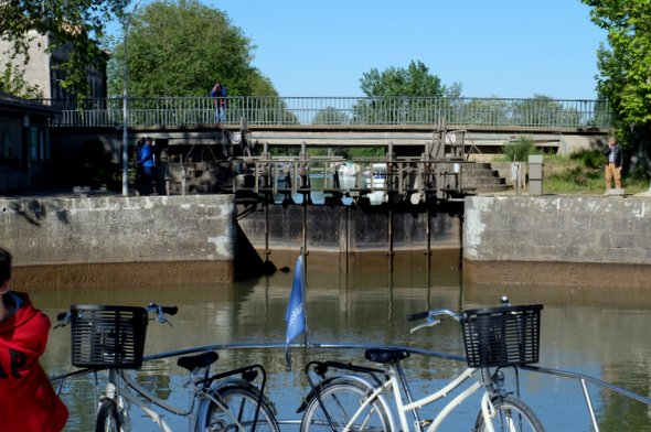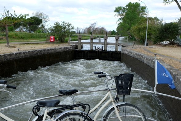 Passage de l’écluse ronde de Agde avec brio (qu’on a laissé sur place). Cette partie du Canal du midi sent déjà la Camargue, il a des aigrettes et des hérons aux étangs de Bagnas, des mouettes ou des cormorans (lequel a le bec rouge ?). Pense pas bête : prendre des jumelles.