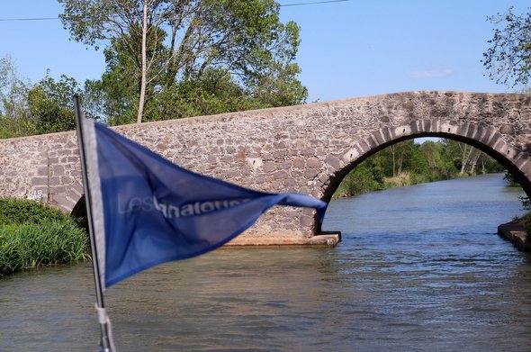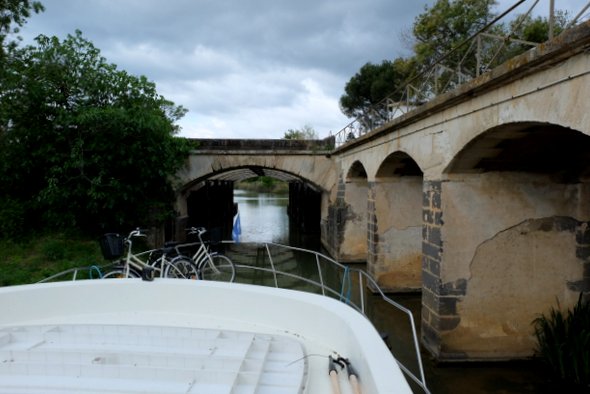 Mon bro, qui est un vrai marin d’eau douce, nous a aidé à passer les premiers ponts (photo 2 : l’ouvrage de Vias construit par Vauban en 1857 pour isoler les deux bras du canal au passage de la rivière Libron. #lecoledelavie) et surtout la première écluse (de Portiragnes).