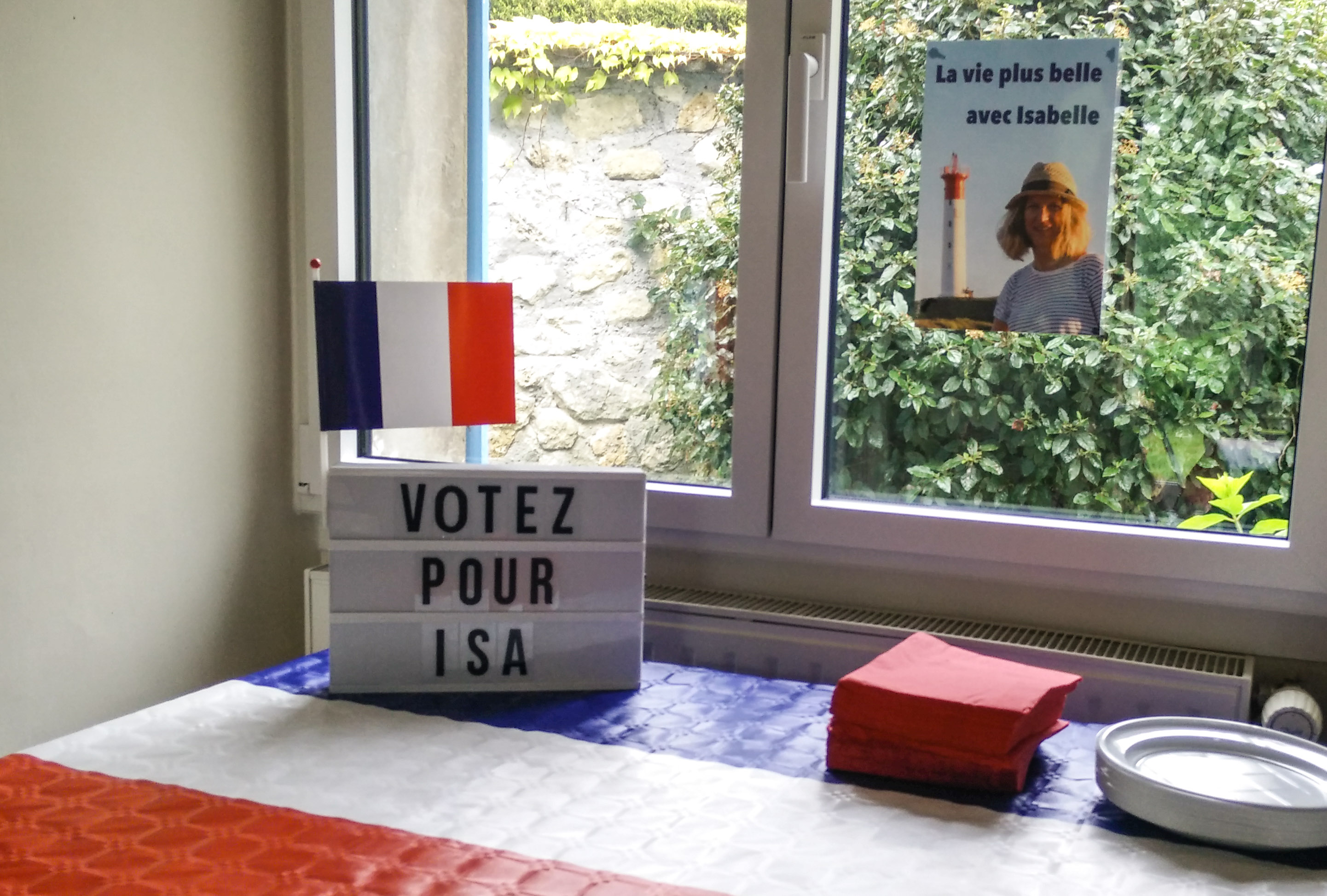Ma dircom de 10 ans m’a trouvé un beau slogan (Avec Isabelle, la vie plus belle. Ça change des rimes avec poubelle) et une nappe tricolore au coin des bonnes affaires (les restes du Mondial sans doute !).